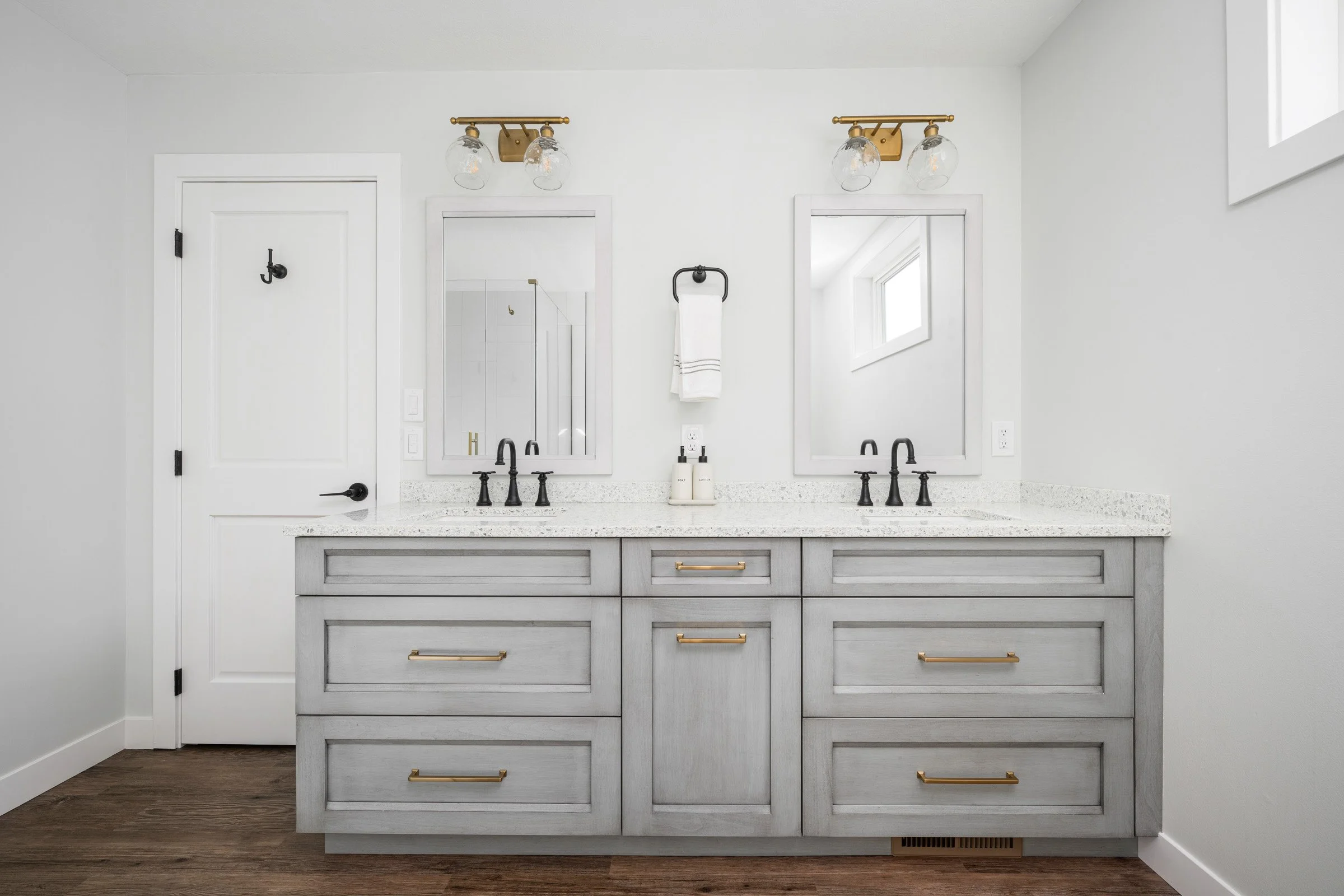 This space was transformed with a soft, neutral palette and refined details that balance warmth and sophistication. The custom vanity in weathered gray pairs beautifully with matte black fixtures and brass accents, while a glass-enclosed shower and light-filled layout make the room feel open and inviting. Simple, timeless, and effortlessly elegant.