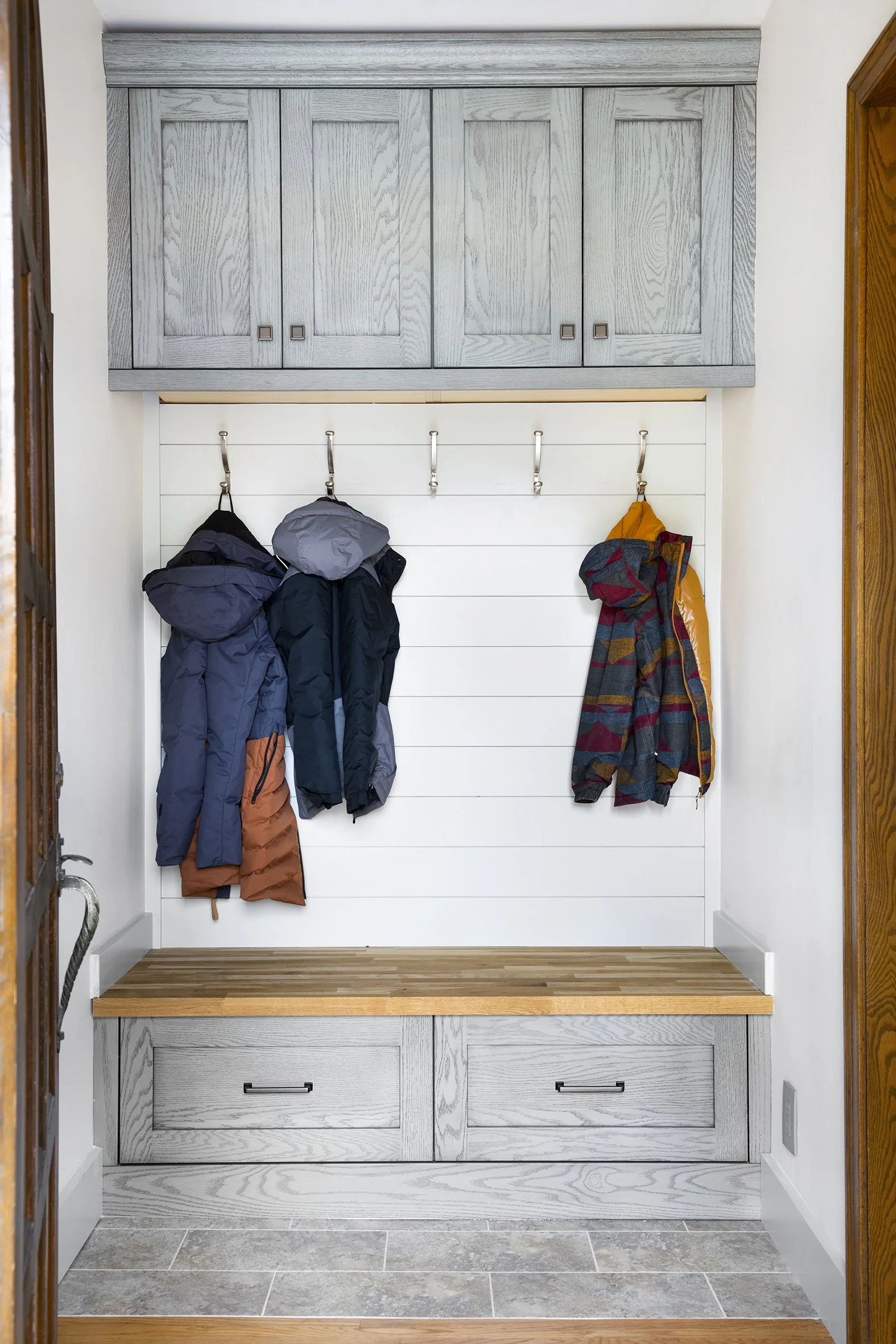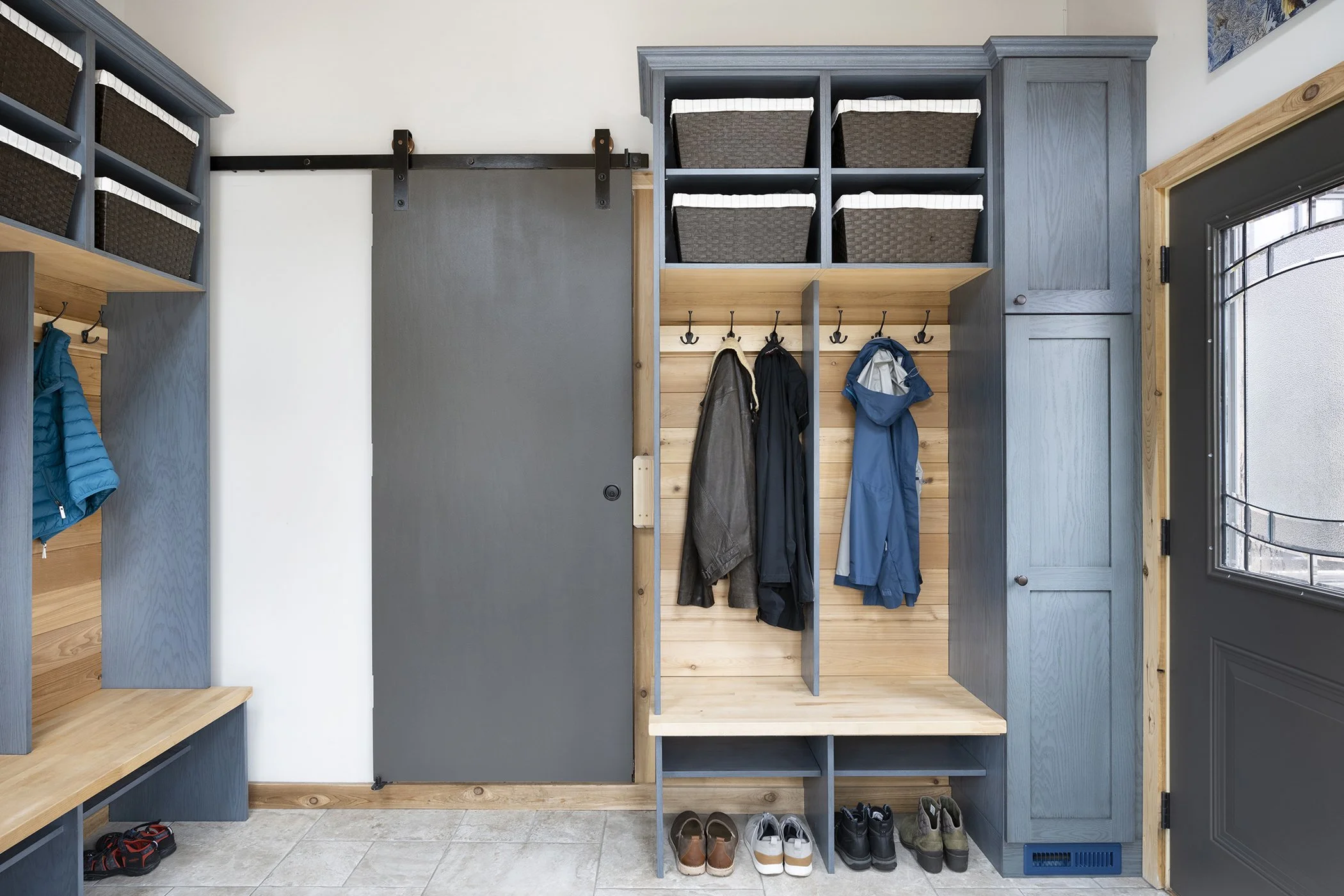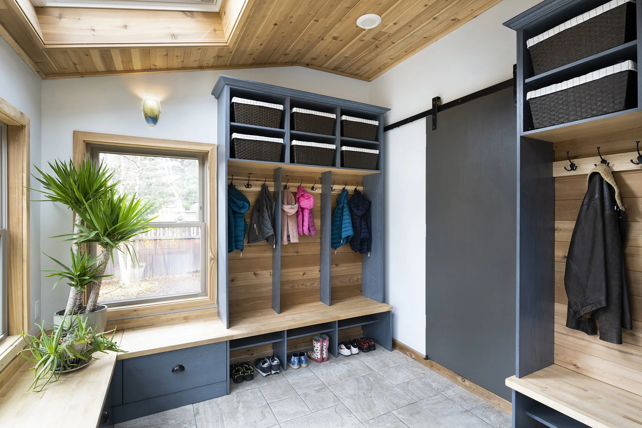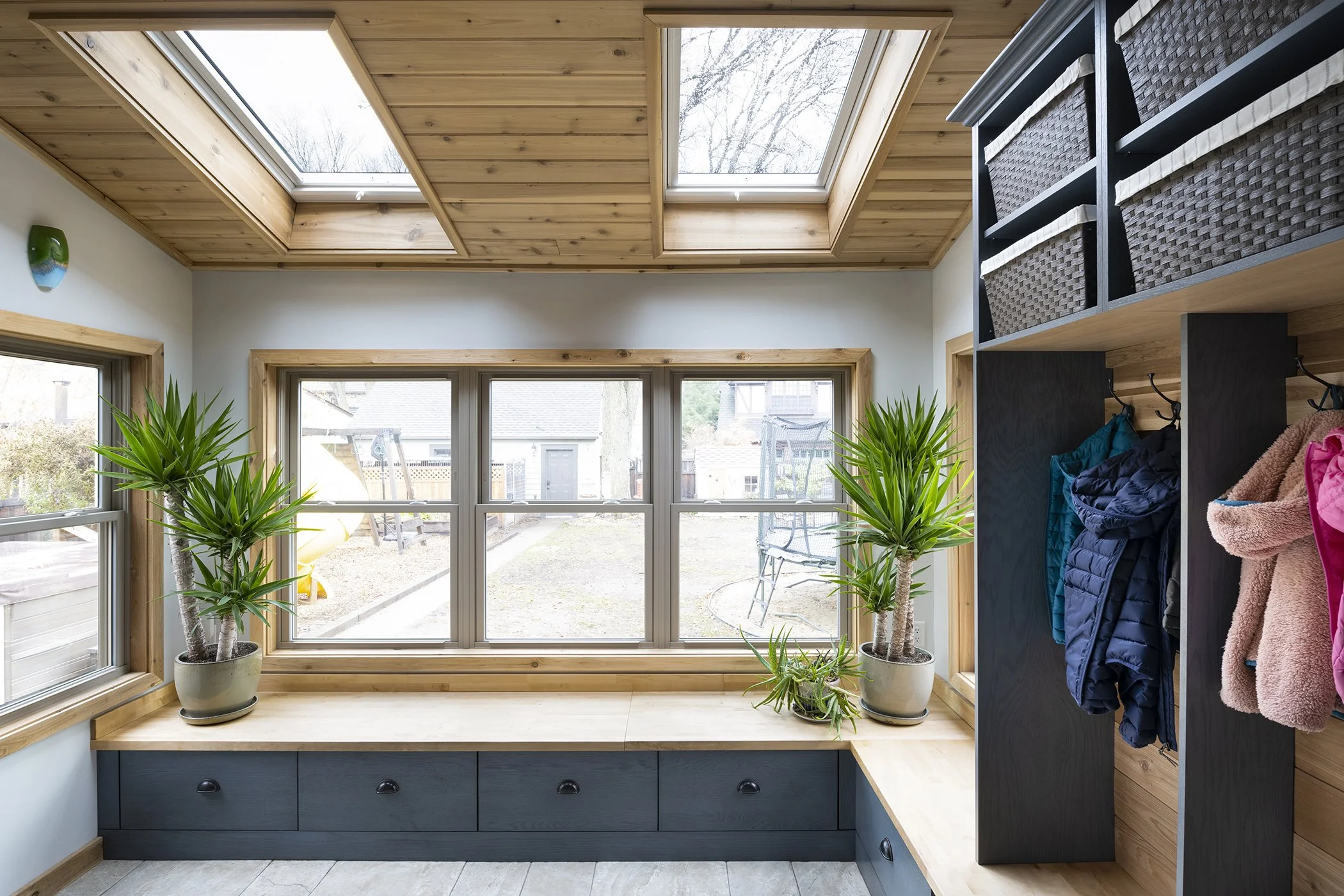 This mudroom uses skylights and large windows to let in the light and maximize the view of the yard (and keep an eye on the kids!). Storage is optimized with built-in coat and shoe racks, and a playful swinging hammock chair makes a way to enjoy the evening stars through the Velux windows from indoors. This entryway also boasts blue reef oak cabinets, cedar furniture, and a heated Versailles tile floor to add additional warmth and comfort.